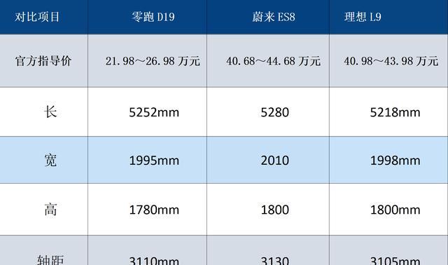 家用SUV,空间绝对是硬指标,先看车身尺寸,零跑D19的长宽高是5252mm、1995mm、1780mm,轴距达到3110mm,理想L9尺寸略小一点,长宽高5218/1998/1800mm,轴距3105mm,蔚来ES8的尺寸也差不多,属于同一梯队,都是标准的全尺寸SUV。