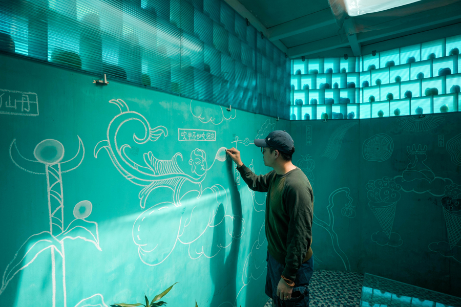 墙面上的透视图由教授、学生、艺术家、村民、游客等共创,还有村狗留下的四只脚印。