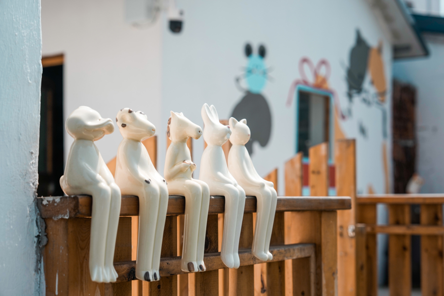 在马门村,艺术并非高高在上的展品,更强调共创、共享、共乐。进村小路正对着的一面墙上,有同济大学俞泳教授、他的“老外”学生、村民、艺术家、游客等共同创作的一幅透视图,村里小狗也留下了四枚小脚印。小路边随处可见的拴马桩上,陶艺小马憨态可掬,有的四脚朝天、有的俏皮昂首,这些都是艺术家与孩子们一起动手完成的……